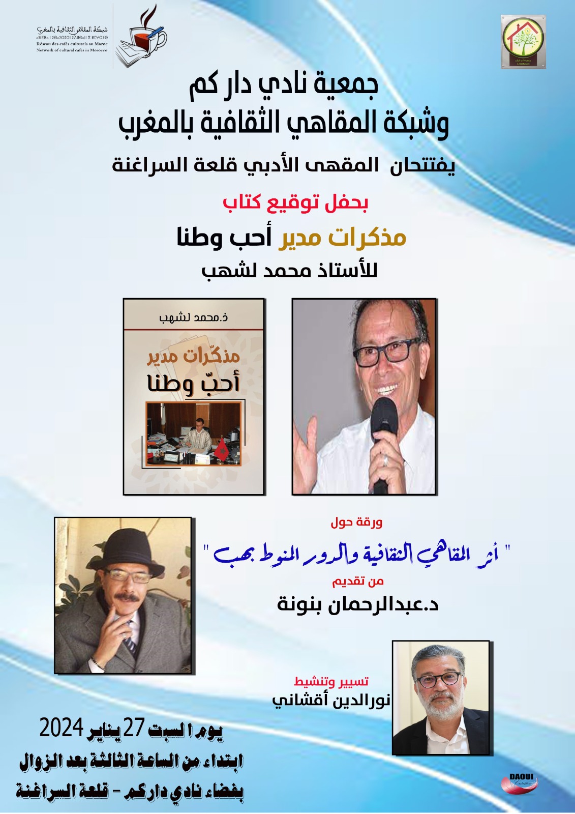 كما سيحتضن فضاء نادي داركم المقهى الثقافي الأول بحفل توقيع كتاب ” مذكرات مدير أحب وطنا ” للأستاذ محمد لشهب بمشاركة الدكتور عبدالرحمان بنونة بعرض حول ” دور المقاهي الثقافية في ترسيخ الوعي الثقافي ” وذلك يوم السبت 27 يناير 2024 إبتداء من الساعة الرابعة عصرا بقلعة السراغنة.ويسير هذا اللقاء وينشطه الفاعل الجمعوي ورئيس الشبكة نورالدين أقشاني .