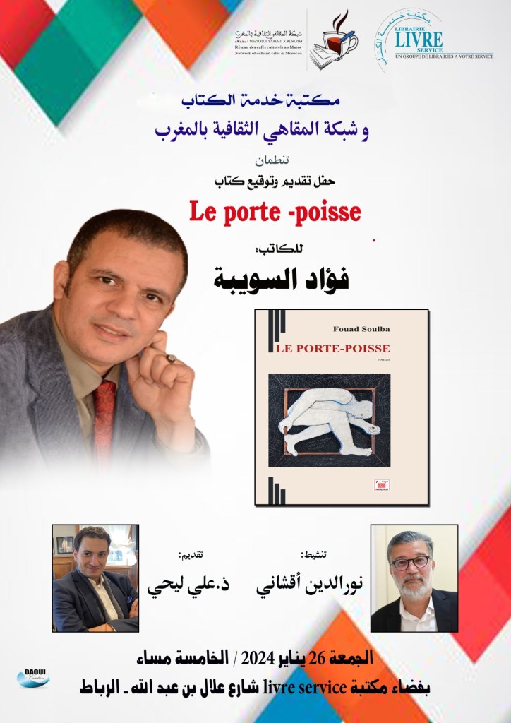 تنظم شبكة المقاهي الثقافية بالمغرب ومكتبة خدمة الكتاب حفل تقديم وتوقيع كتاب “le porte – poisse ” للكاتب فؤاد السويبة وذلك يوم الجمعة 26 يناير 2024 على الساعة الخامسة مساء بفضاء مكتبة livre service شارع علال بن عبد الله بالرباط .