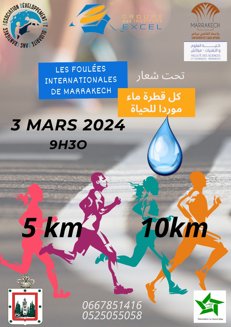 في إطار الحملة التحسيسية للحفاظ على الموارد المائية بمراكش تنظم جمعية التنمية والتضامن بلاحدود بشراكة مع مجموعة إكسيل و كلية العلوم التابعة لجامعة القاضي عياض بمراكش وجمعية الاطلس الكبير بمراكش والعديد من الشركاء سباقا على الطريق في دورته الخامسة تحت شعار ” الماء هو الحياة فلنحافظ عليه” بساحة 16نونبر بجليز.