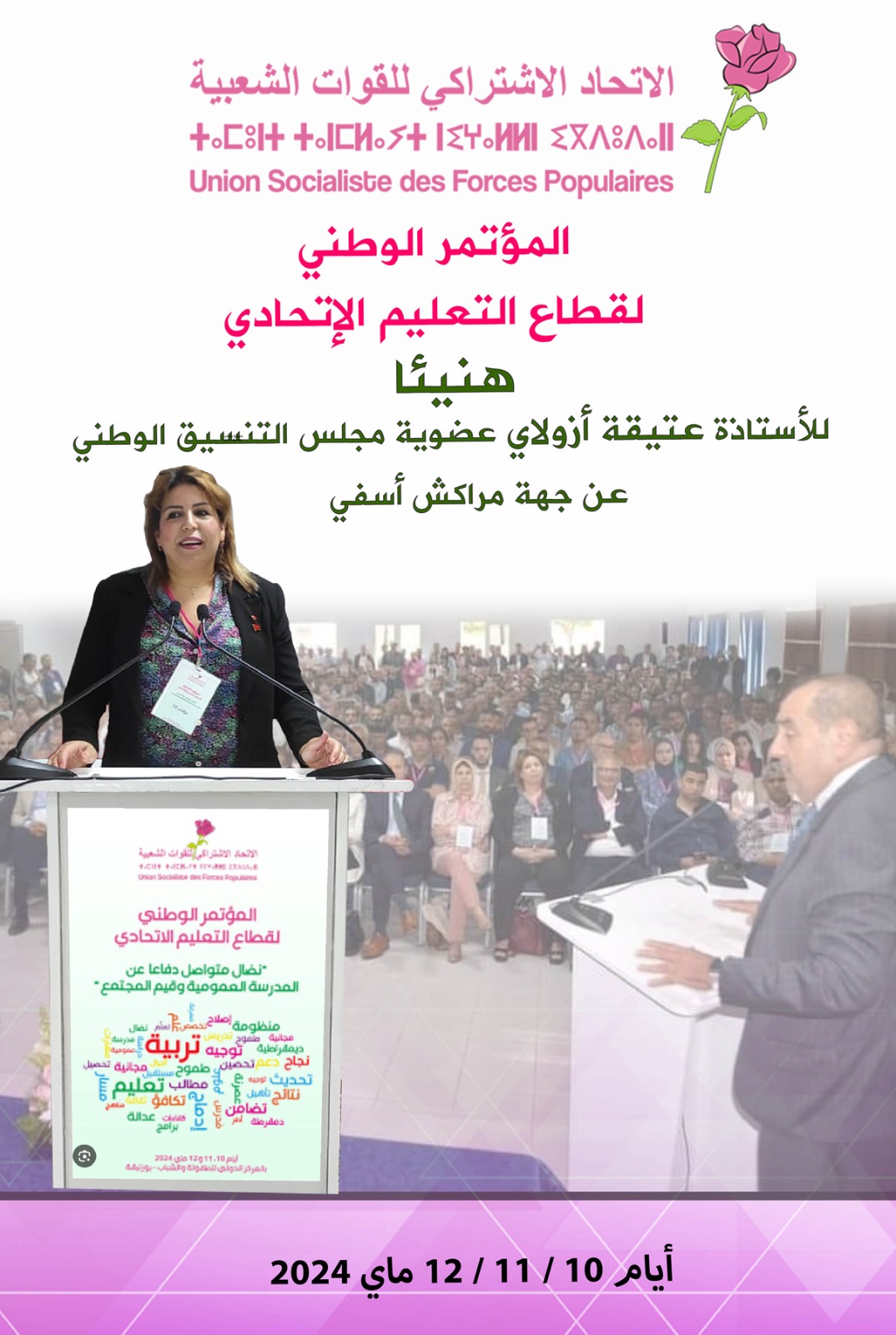 اسفرت أشغال المؤثمر الوطني لقطاع التعليم الاتحادي،المنعقد خلال الفترة المتراوحة مابين 10و12ماي الجاري بالمركز الدولي للطفولة والشباب بمدينة بوزنيقة ،عن انتخاب الإطار الإداري والتربوي بالأكاديمية الجهوية للتربية والتكوين بجهة مراكش اسفي ،عتيقة ازولاي، كعضو بمجلس التنسيق الوطني عن جهة مراكش اسفي