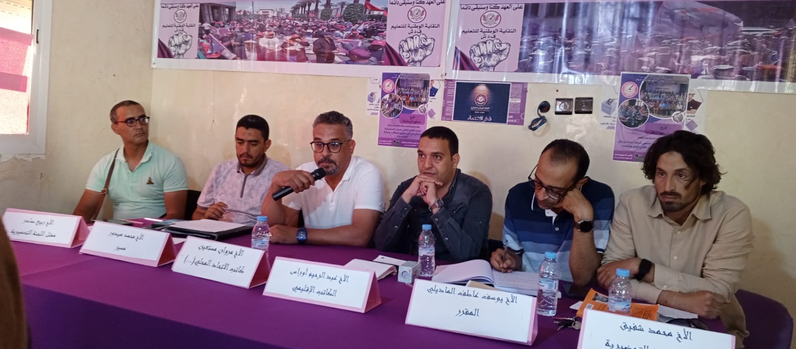 تجديده لقرار مقاطعة اللقاءات المهزلة التي تدعو إليها المديرية الإقليمية مخافة المشاركة في تدمير الشأن التربوي بالإقليم وتحمل وزر الشغيلة التعليمية؛استنكاره الشديد للطريقة الشيطانية التي دبرت بها المديرية الإقليمية عملية تدبير الفائض والخصاص لجميع الأسلاك، ودعوتها المديرية إلى التراجع عن مثل هذه الأساليب المقيتة وانصاف المتضررين؛تجديد تضامنه المطلق واللامشروط مع الشغيلة التعليمية ضحايا عملية تدبير الفائض والخصاص مع دعوتهم تقديم الطعون داخل الآجال القانونية؛شجبه للحيف والظلم الذي يطال فئة المتصرفين التربويين من طرف المديرية الإقليمية بإصدارها لتكليفات غير قانونية (9 تكليفات) إلى جانب التعمد في الحط من قيمة هذه الهيئة من خلال طريقة إصدارها دون استحضار للمقاربة التشاركية مع الهيئة المعنية التي تمارس أدوارا ريادية ولا تزال، خدمة للناشئة والرقي بالمنظومة التربوية؛تحذيره للمديرية الإقليمية ومعه المصالح المختصة من التقليل من شأن الأطر المختصة بمختلف فئاتهم، ودعوته للمديرية بالتراجع الفوري عن التكليفات العشوائية التي تصدرها لإرهاق كاهلهم بمهام إضافية دون تعويض مادي عن المهام خارج الإطار؛دعوته المديرية الإقليمية بصرف التعويضات العينية الخاصة بمختصي الإدارة والاقتصاد إسوة بباقي المديريات الإقليمية، مع إيلائهم المكانة الاعتبارية للدور البارز الذي يقومون به، مع حثه للمديرية على تسوية ما بذمتها من مستحقات نساء ورجال التعليم بالإقليم (التعويض عن: التصحيح، الدعم، الريادة…)