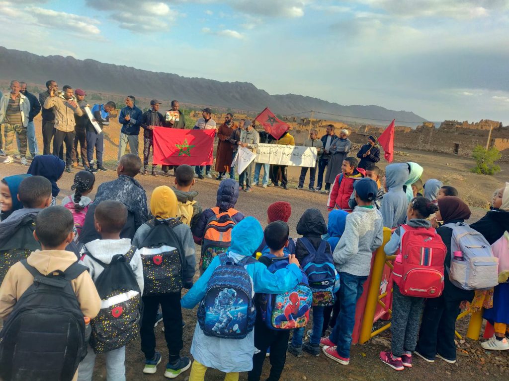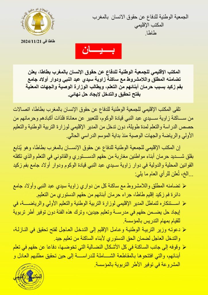وعبر مكتب الجمعية عن تضامنه المطلق واللامشروط مع ساكنة كل من دوار زاوية سيدي عبد النبي ودوار أولاد جامع دئرة فم زكيد إقليم طاطا، جراء حرمان أبنائهم من حقهم الدستوري من التعليم، كمااستنكر تماطل المدير الإقليمي لوزارة التربية الوطنية والتعليم الأولي والرياضة في إيجاد حل يضمن حقهم في مدرسة وتعليم جيدين، وتركه لهذه الفئة دون توفير أطر تربوية للقيام بمهام التدريس بالمؤسسة.