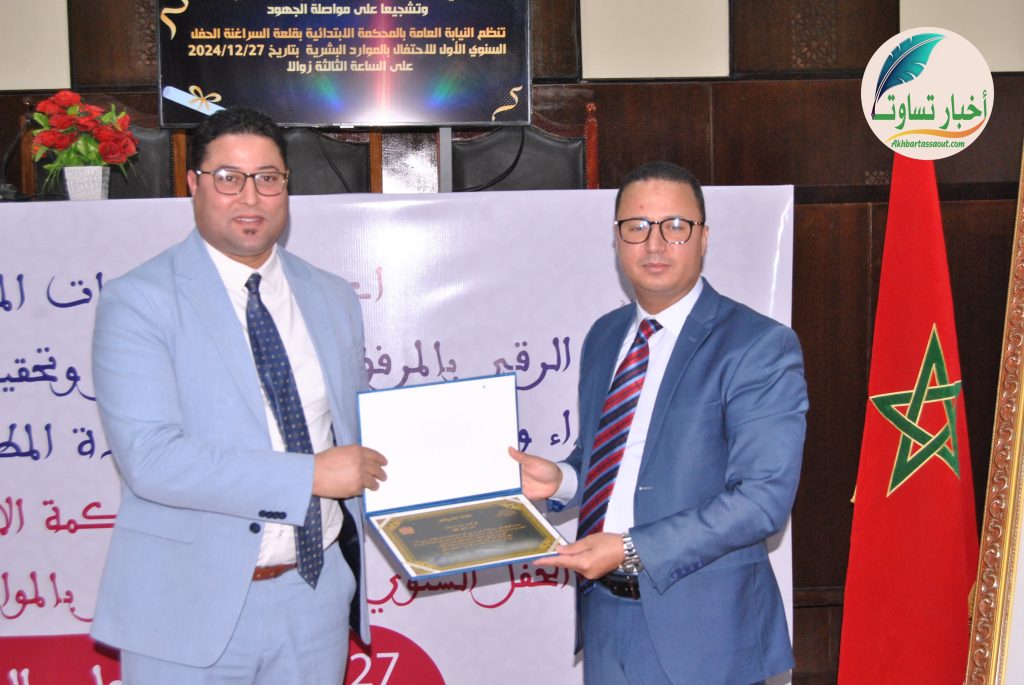قال الدكتور سعيد بوطويل وكيل الملك لدى المحكمة الابتدائية لقلعة السراغنة يوم أمس الجمعة 27 دجنبر الجاري،في حفل الموارد البشرية للنيابة العامة،مخاطبا موظفي هذه المؤسسة “ان مبادرة الاحتفال بالفريق في شخص من يمثلكم والله مبدأ من مباديء الإيثار والايخاءالتي يقل نظيرها”.
