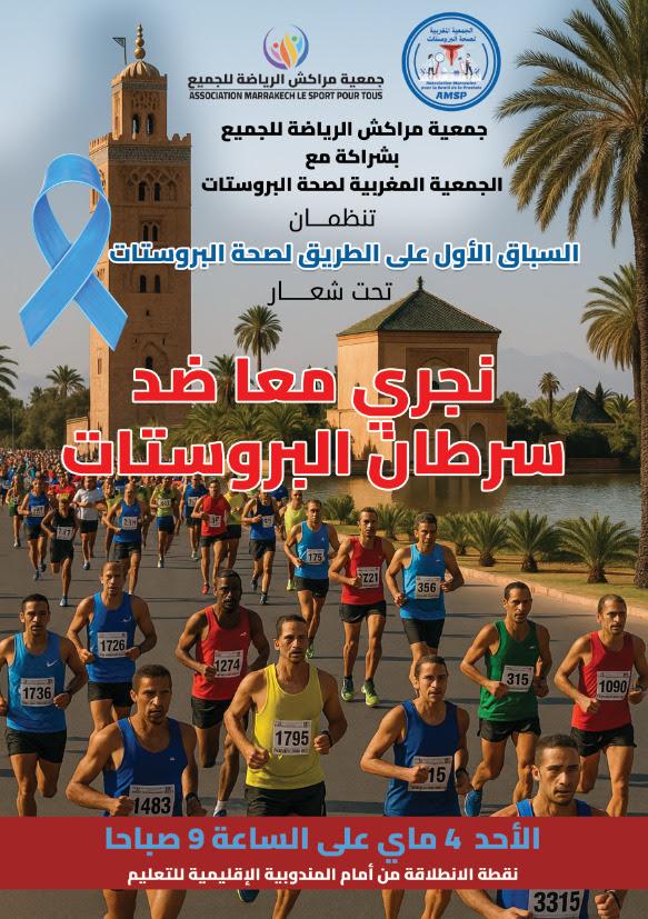 كما تنظم الجمعية المغربية لصحة البروستات بشراكة مع جمعية مراكش الرياضة للجميع السباق الأول على الطريق لصحة البروستات تحت شعار : “لنجرِ جميعا ضد سرطان البروستات”، وذلك يوم الأحد 4 ماي 2025 بمراكش.