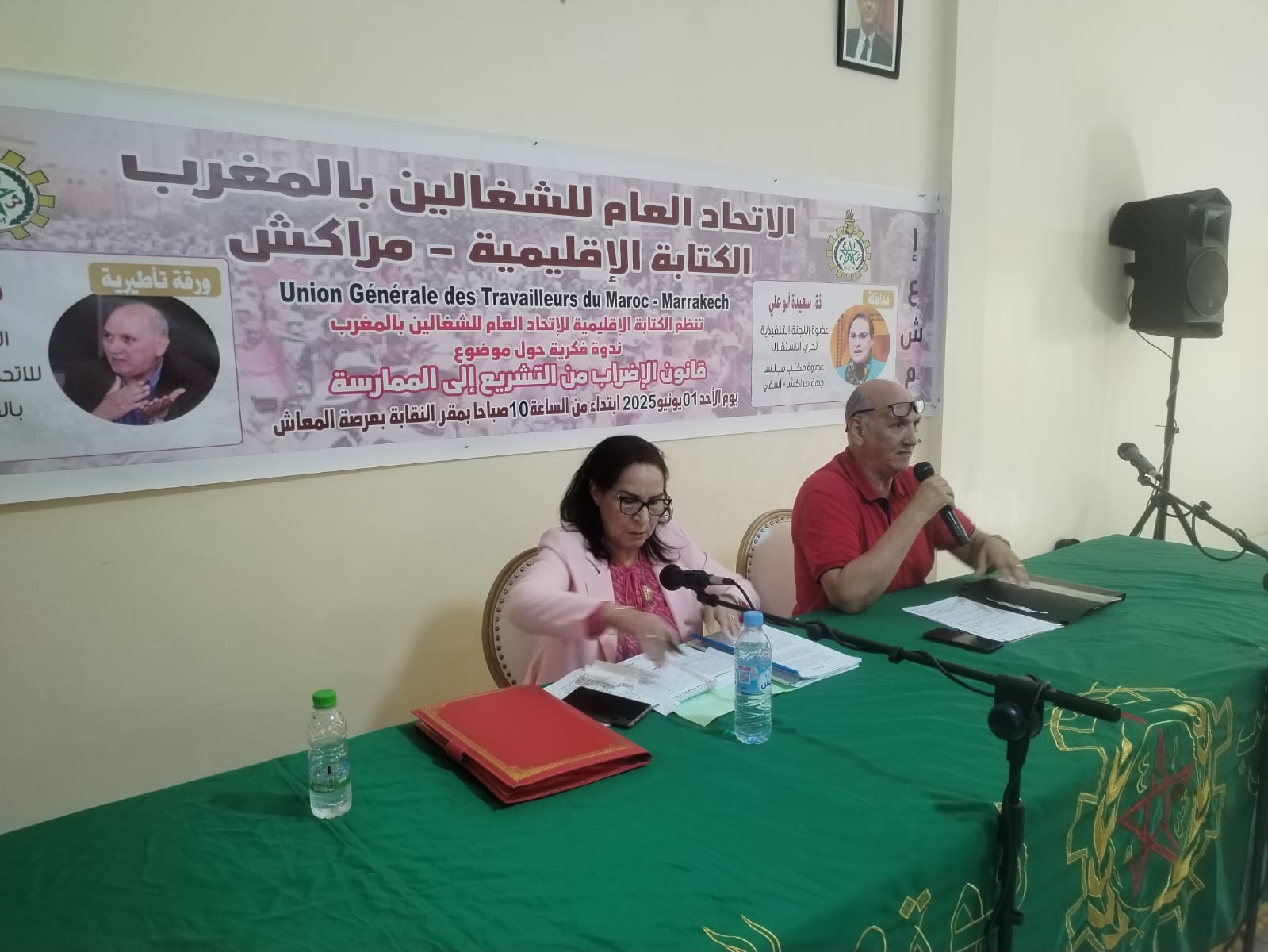 نظم الاتحاد العام للشغالين بالمغرب بمراكش اليوم الاحد فاتح يونيو 2025،ندوة في موضوع,” قانون الإضراب من التشريع الى الممارسة “وذلك بحضور نخبة من المهتمين،والفعاليات المهنية والنقابية بالمدينة،و خلال افتتاح اشغال الندوة التي احتضنها مقر الاتحاد العام للشغالين بالمغرب بعرصة المعاش بمقاطعة مراكش المدينة، قدم ذ ،محمد مبتهيج الكاتب الاقليمي للاتحاد العام للشغالين بالمغرب بمراكش ورقة تأطيرية لموضوع قانون الإضراب، تطرق فيها الى كل المراحل التي قطعها مشروع القانون 15.97 من وضعة بمجلس النواب سنة 2016 الى اصداره بالجريدة الرسمية بتاريخ 25 مارس2025 و رفض المحمكة الدستورية الطعن التي تقدمت به بعض النقابات.