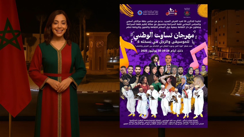 تستعد جمعية جيل السلام للثقافة والفنون والرياضة لتنظيم مهرجان تساوت الوطني للموسيقى والزجل في نسخته السادسة بمناسبة الذكرى 26 لجلوس جلالة الملك محمد السادس على العرش ، و من المقرر في هذه الدورة أنها ستكون مخصصة في احتفال مدينة قلعة السراغنة بكل جوارحها بعيد العرش المجيد تحت شعار ” قوة الفن ودوره الفعال في الإلتحام بين الشعب والعرش ” ، الافتتاح بمعرض المنتوجات المحلية تحت إشراف جمعية التنمية المقاولاتية ستشارك فرق موسيقية وطنية وجهوية ومحلية ، ويشمل المهرجان كرنڤال فولكلوري يبدأ من أمام البلدية مرورا بشارع محمد الخامس وينتهي امام فندق الزاوية ، وسهرات فنية طيلة ايام المهرجان بدار الثقافة والساحة الفضية ، ندوة بالمكتبة العمومية دار الثقافة حول دور الفن في الإلتحام بين الشعب والعرش ، أمسية زجلية وشعرية بدار الجمعيات، تنظيم معرض محلي للمنتوجات المحلية برياض دار الثقافة طيلة أيام المهرجان تحت إشراف جمعية التنمية المقاولاتية.